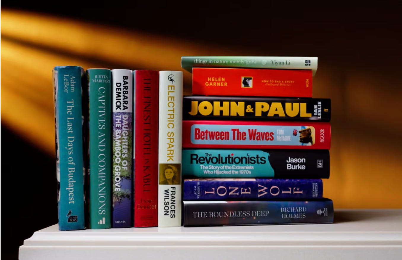 Some exciting news: John & Paul has been longlisted for the Baillie Gifford Prize, the most prestigious nonfiction book prize. It’s in fine company, as you can see below. I must say I think our spine comes off pretty well here…
