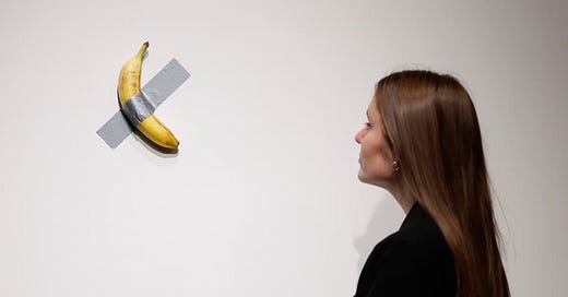 In 2019, Maurizio Cattelan framed Comedian as a satirical commentary on contemporary art: “At art fairs, speed and business reign, so I saw it like this: if I had to be at a fair, I could sell a banana like others sell their paintings. I could play within the system, but with my rules.” Conceptual artworks like this have a recursive quality: the more people talk about them, the more value they acquire, the more people talk about them, and so on.