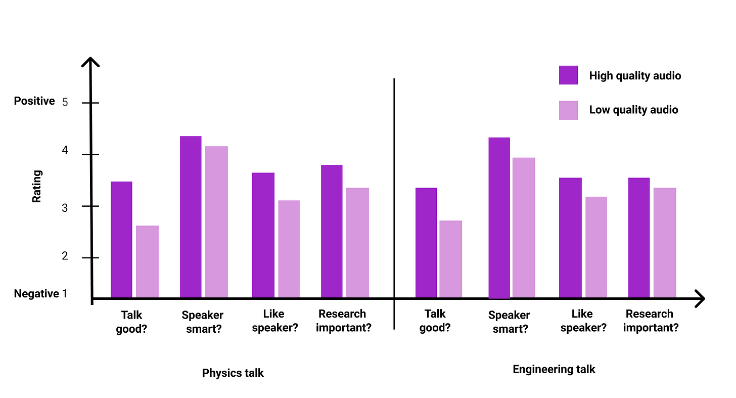 Here’s some evidence for that. When people without expertise in physics watched a YouTube talk given by a physicist, they rated it nearly 20% better when they heard it high quality audio versus those who heard it in low quality. To be clear, they weren’t just judging the recording; they were forming opinions on the talk, and on the person. Speakers were rated smarter and more likeable when the sound of their voice was better to listen to.